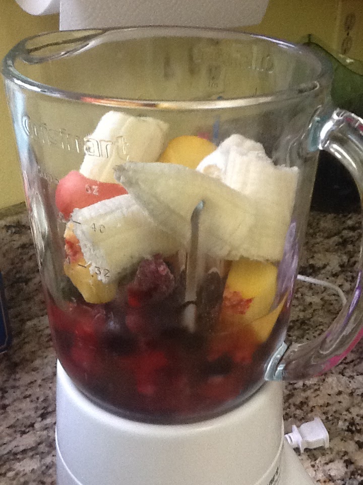 I simply fill my blender with frozen berries, a couple of nectarines, a banana, some peach-mango juice, and two containers of Greek yogurt. Some people add spinach. My husband would not in a million years, ever, ever drink a green smoothie. So there. No spinach.