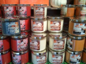 Still, at Bath and Body Works, there is a display of candles and body creams and fragrances that include Blueberry Pumpkin Patch and Pumpkin Pecan Waffles and Pumpkin Apple and Sweet Cinnamon Pumpkin and Pumpkin Cupcake and Pumpkin Carving. Can Pumpkin Cupcake really smell that much different than Pumpkin Pecan Waffles? And frankly, after carving a pumpkin, I can’t wait to get that mess cleaned up because I think it smells really bad. I burn a citrus candle to get rid of that smell.