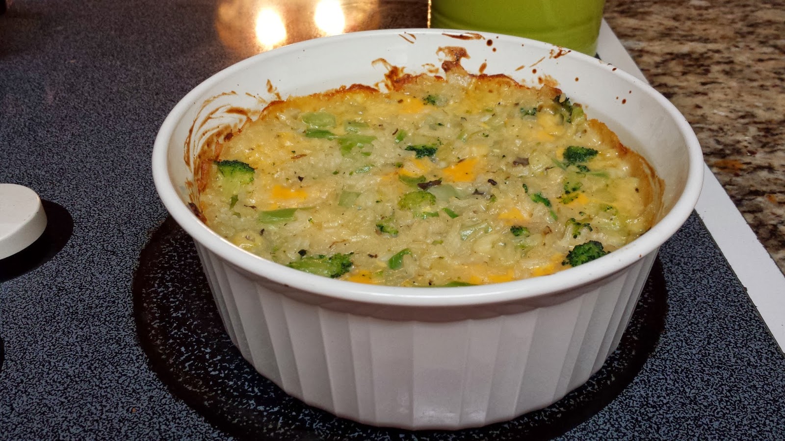 Saute 1 large onion and 1 clove of garlic (chopped fine) in butter and a little oil. Add 1 pkg of frozen chopped broccoli, 1 can cream of chicken soup OR cream of mushroom soup, 1/2 c. milk, 1 c. Velveeta cheese (1 small bar), and 3/4 t. salt. Undercook 1 cup of rice (which makes 2 c. of cooked rice. Mix all of the ingredients in a baking dish and bake at 350 degrees for 30 minutes.