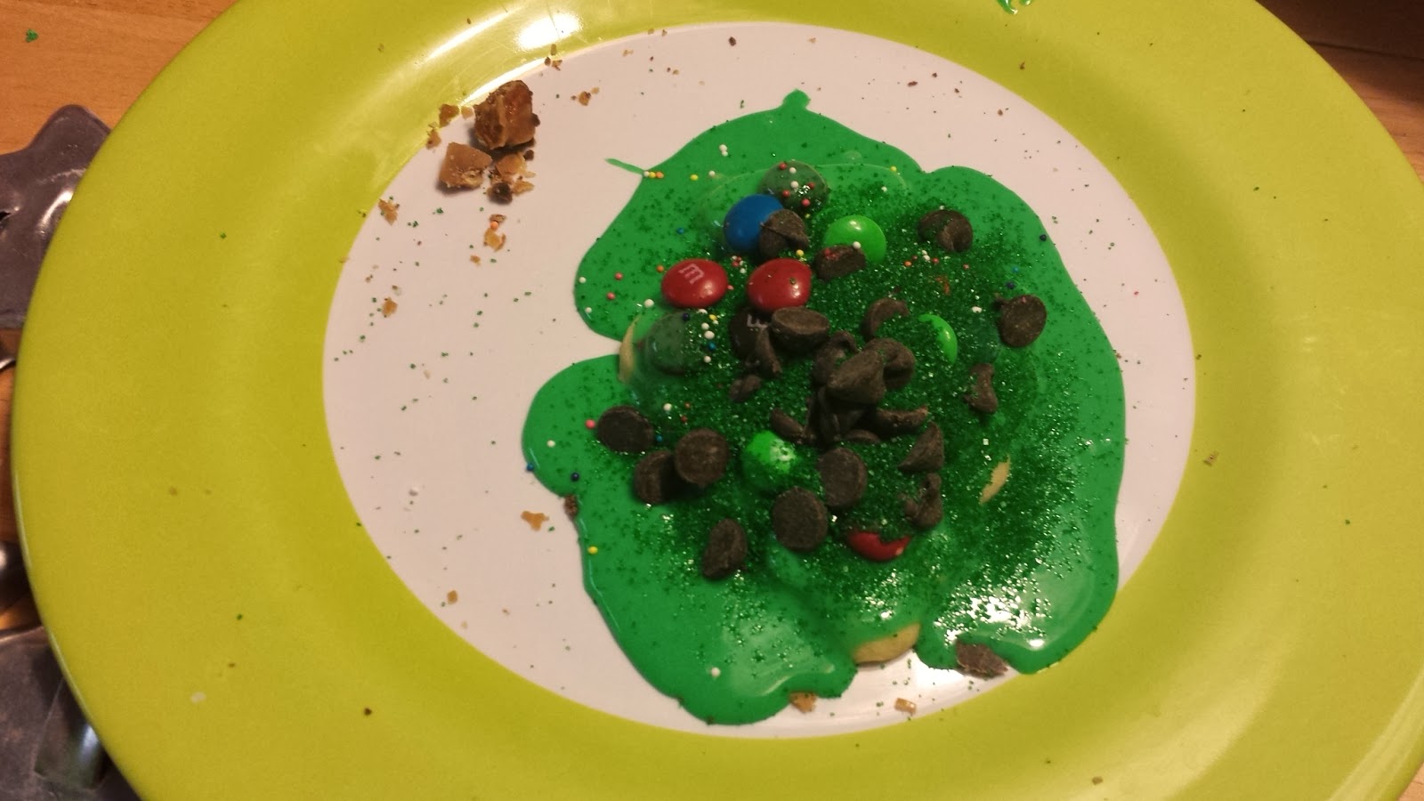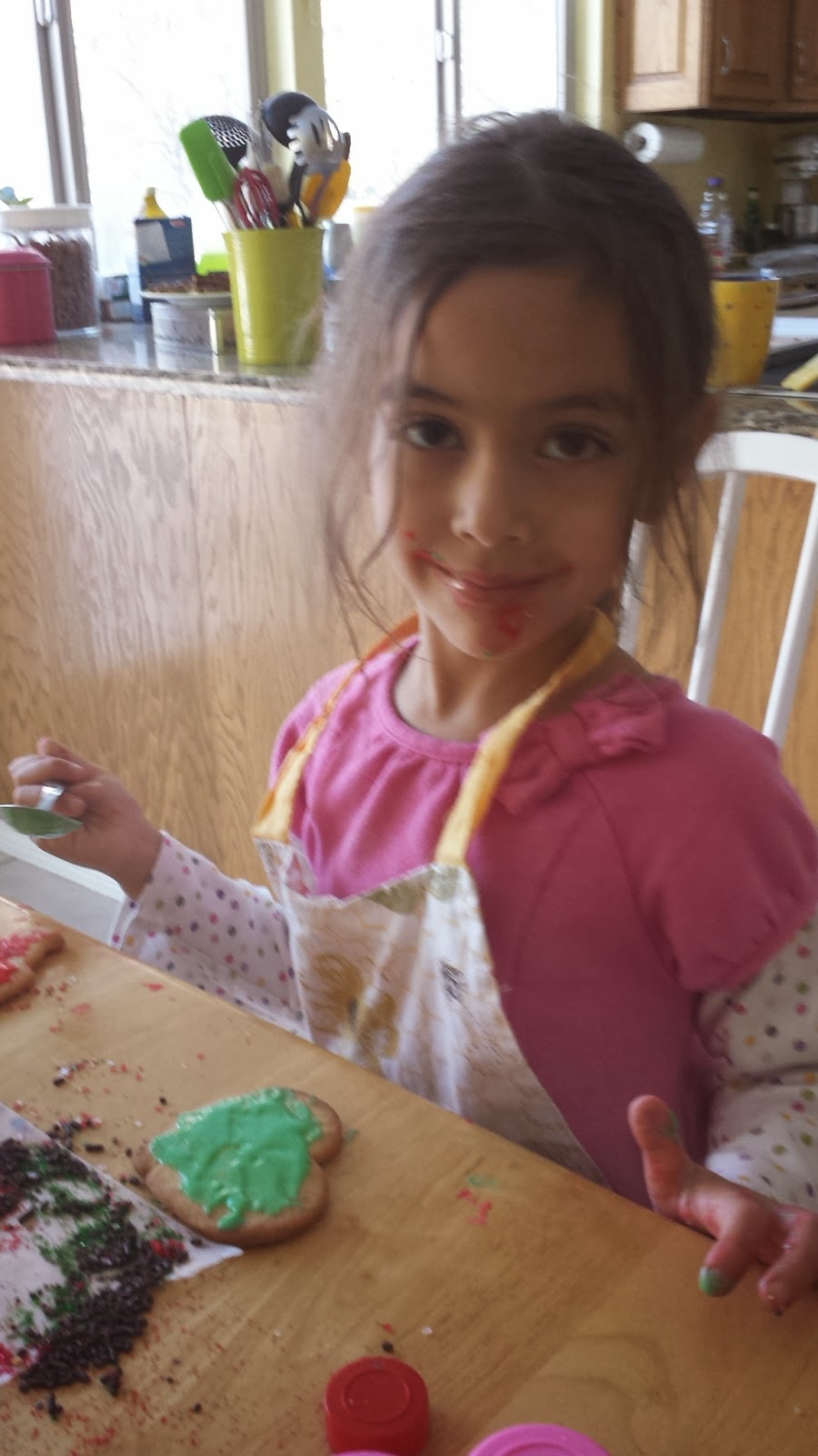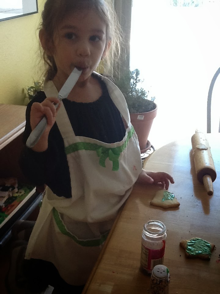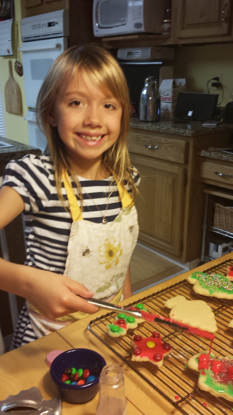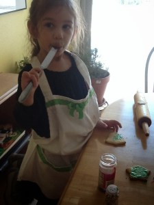 At the tail end, while the others had moved on to hide-and-seek, Dagny carefully took her last Christmas tree shaped cookie, and poured all of the remaining icing over the entire cookie, decorated it with every last remaining M&M and chocolate chip, and grinned her little missing-teeth grin in total satisfaction.