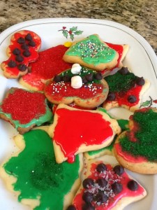 One of the best things about Christmas is holiday baking and cooking. And I’m never happier than on my annual Grandchildren-Sugar-Cookie-Decorating Day. It is organized chaos at its best. There is colored sugar and pieces of dough everywhere. For days I find drips and drops of colored icing hidden in places where icing doesn’t belong. The cookies invariably turn out garishly but lovingly decorated, heavy on the colored sugar. This year I allowed the use of M&Ms, marshmallows, and chocolate chips.