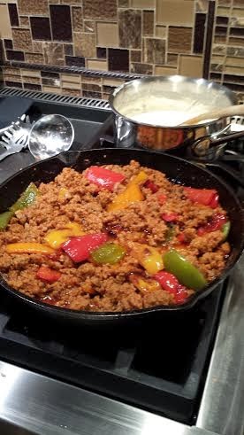 The second sauce was a meat sauce that consisted of a mixture of hot and mild Italian sausage, seasonings, and finished off with fresh red, green, and yellow peppers that had been cooked separately in olive oil to preserve some crispness.
