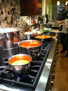 Mark and Susan made three types of sauce for the pasta which would be made later. They made a fresh marinara sauce, which started with a gigantic bowl of a variety of fresh tomatoes. A mixture of tomatoes gives a more complex flavor, Mark explained to me. He cooked the tomatoes for probably an hour, along with onions that he had cooked slowly until they were as sweet as candy. As the tomatoes cooked, you could see them soften and condense. In the end, Susan used a hand blender to puree the soft tomatoes that he had cooked with the onions.