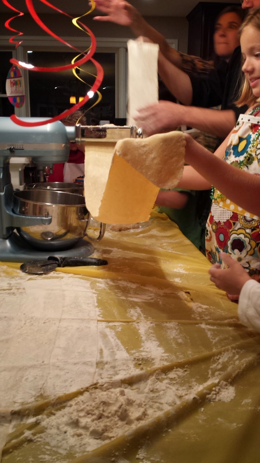 But the real fun came a bit later in the evening, after all of the sauces were almost finished. The kids were called to the table to make the pasta. There were two Kitchen Aid mixers with pasta-makers attached. If you have ever made fresh pasta, you know that you roll out the pasta, sprinkle it with flour, make the rolling mechanism one click thinner, and continue in this manner until your dough is nearly transparent. Then you cut the pasta in the shape you desire.