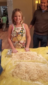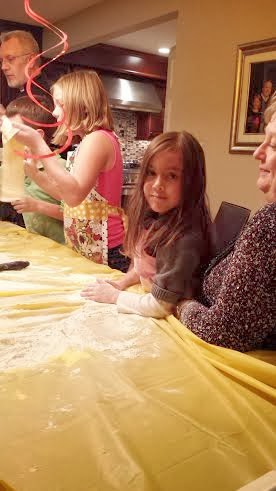 Addie’s job was to roll the pasta. She would lay a piece of rolled pasta onto the table. Dagny, Magnolia and Kaiya added flour. (Mylee was happily playing downstairs by herself where she apparently realized at long last she wouldn’t have to fight bigger kids for the toys she wanted. In her mind, her work was done with the meatballs!)