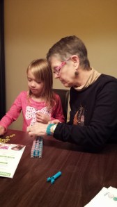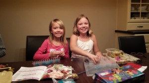 The remainder of the night was spent getting started on building the White House out of Legos and making bracelets out of little rubber loops, using the Rainbow Loom. Addie took all of the things out of her old and broken backpack that she’s had since Kindergarten and put them in her new LL Bean backpack. Maggie played with her doll until bedtime.