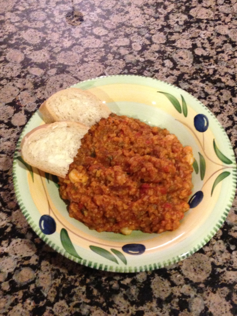 Peel and devein the shrimp. Saute the shrimp in 3 tbs oil in a Dutch oven (medium heat). Stir continuously until all shrimp are pink. Remove shrimp (leave oil), cover and refrigerate. Slice kielbasa into ¼ inch pieces and half. Saute in remaining oil plus 1 tbs additional oil. Kielbasa is already cooked, so simply brown to add another flavor layer. Remove and set aside. In remaining oil, add the onion, green pepper & celery (known as the trinity in Creole cooking). Cook, stirring constantly for 5-7 minutes until your desired consistency. Mince garlic and add, stirring for 2-3 minutes to incorporate well. Add turkey kielbasa back to Dutch oven, and add the crushed tomatoes plus rest of the ingredients. Bring to a boil, then cover, reduce heat and simmer for 45-50 minutes until the rice is soft and most of the water/broth has been absorbed. Stir frequently. Add chilled shrimp and let simmer for an additional 10 minutes. Serve with fresh bread.