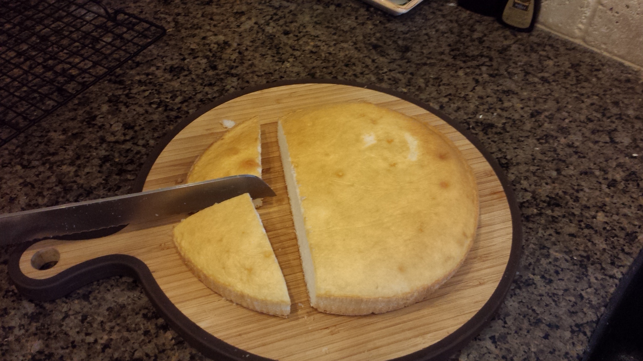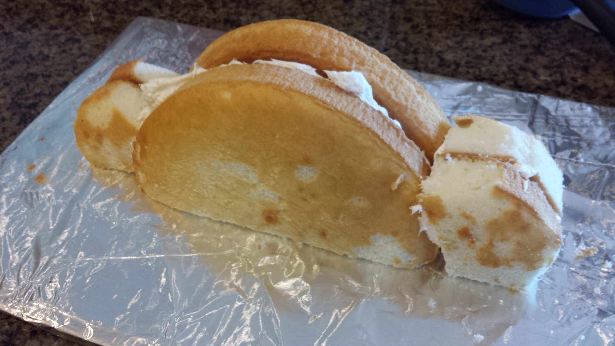 I baked a two layer white cake. I chose to use a cake mix since I wasn’t sure how it would turn out. I baked it the night before and put the two layers in the freezer so they would be easier to work with….
