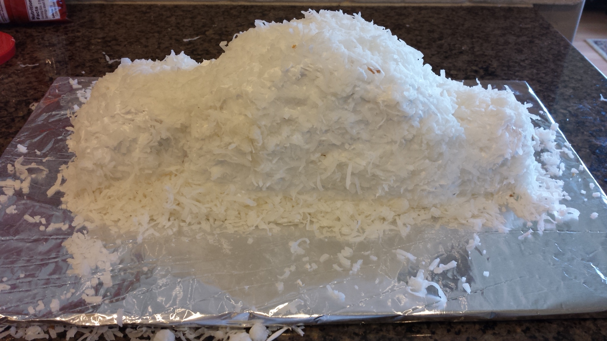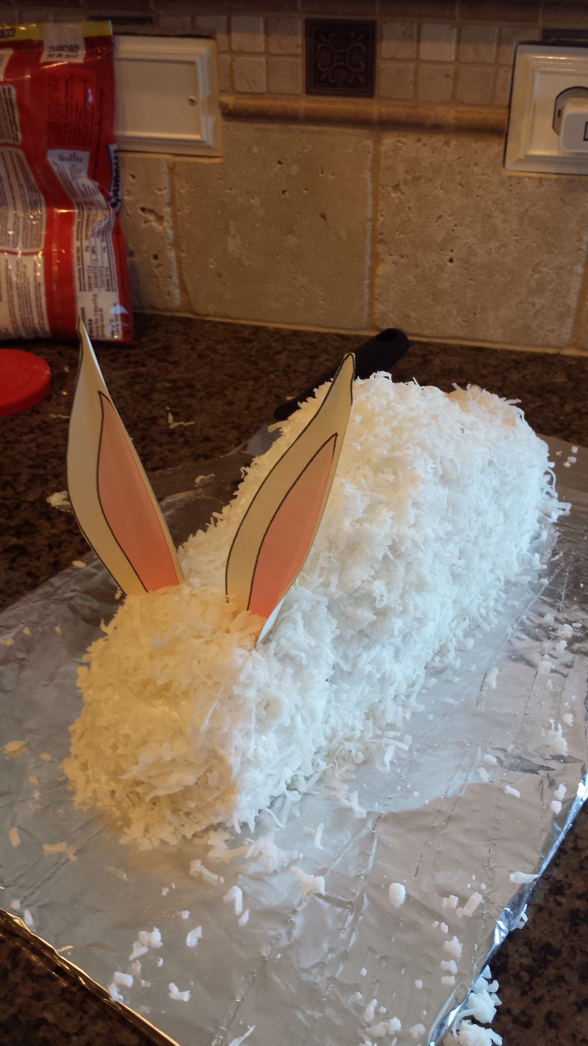 I iced the cake and covered it in sweetened coconut. At this point it looks like a 1956 Chevy that has been left out in a snow storm. No rabbit resemblance….