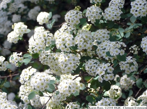 Now the spirea are in bloom. Spirea, the bush with white flowers that look like