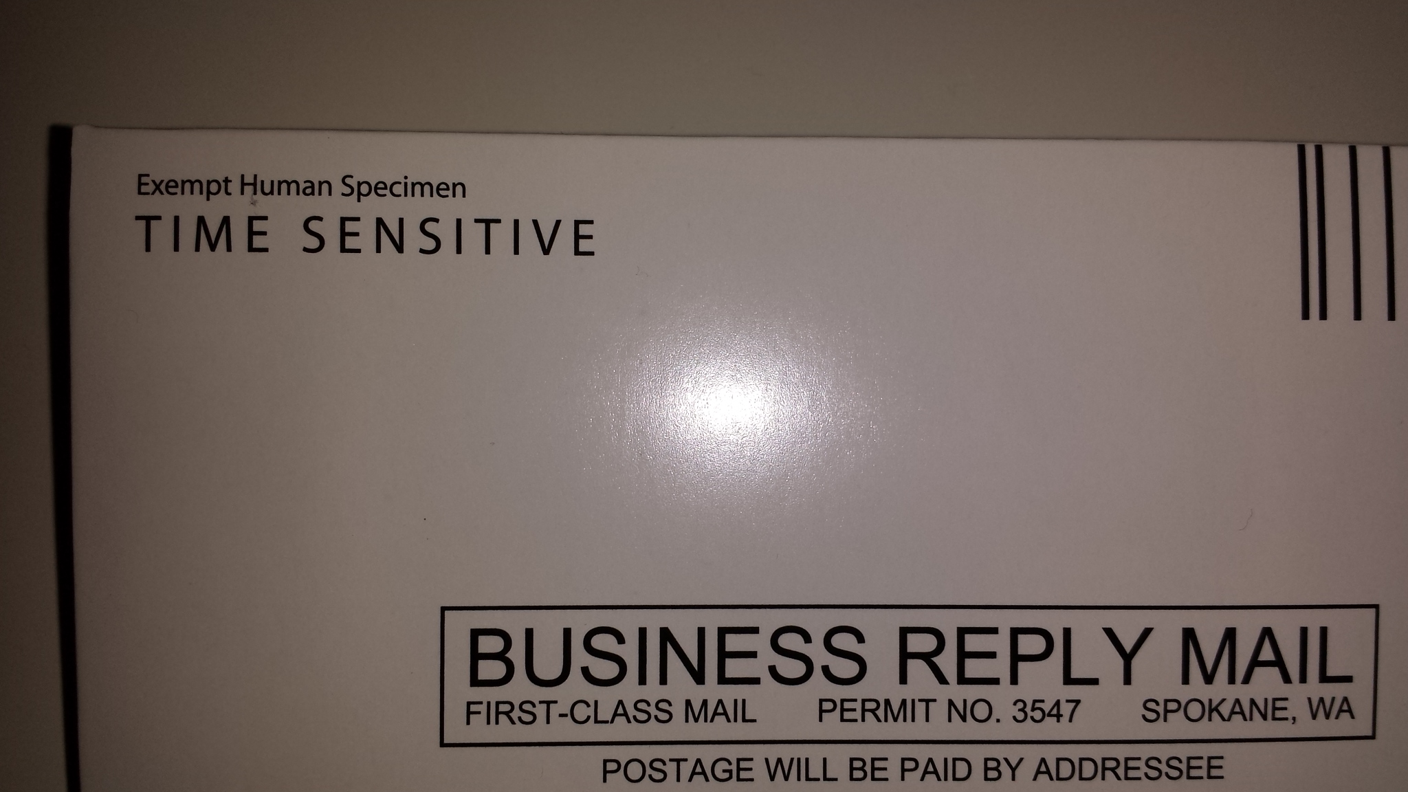 But guess what? This year, I ACTUALLY DID WHAT I WAS SUPPOSED TO DO. I gathered the necessary, well, material, put it in the little plastic tube, placed the tube into the addressed and stamped envelope provided, took a 15-minute shower, and tried to figure out what to do with the envelope.