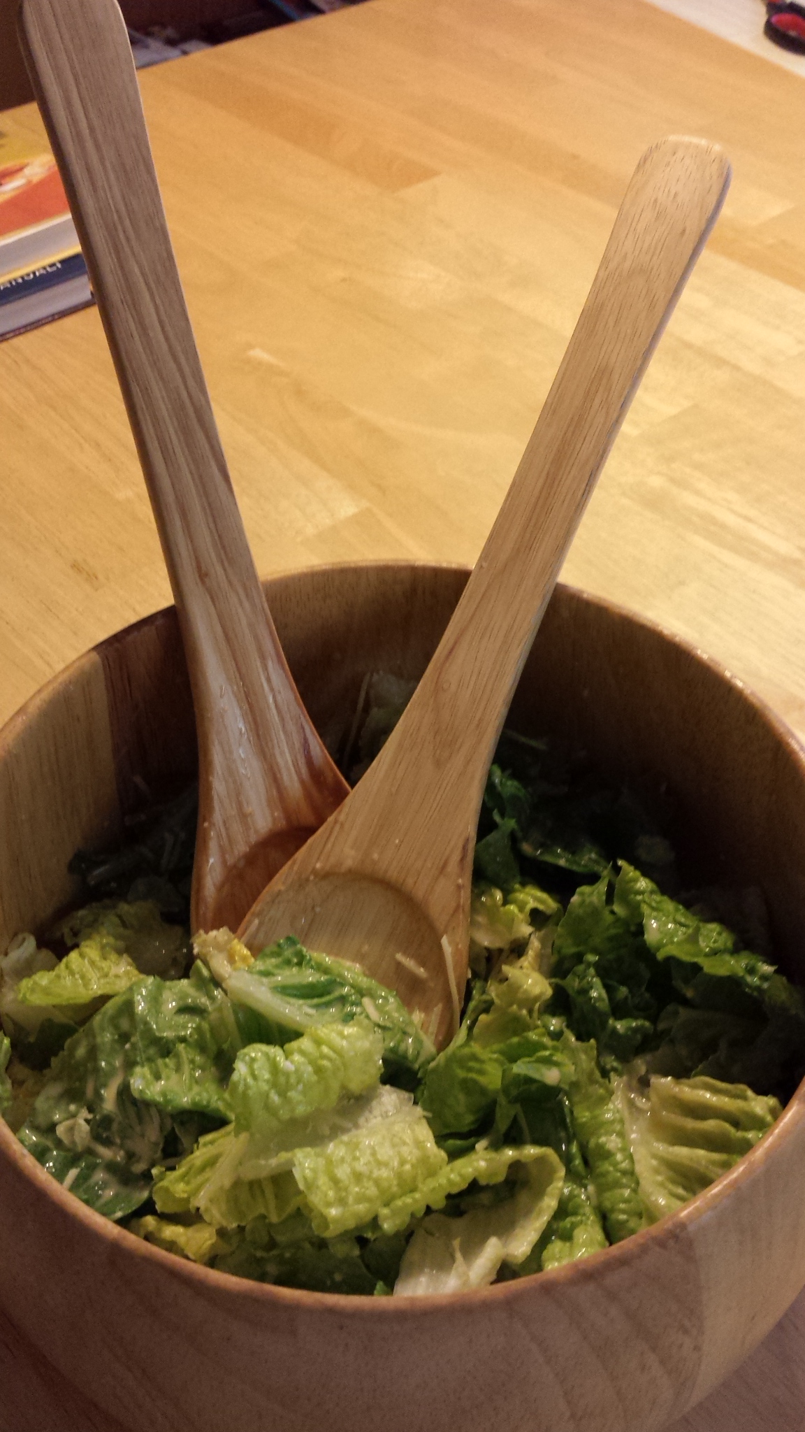 Nana’s Notes: Bill and I aren’t crazy about croutons, so we didn’t bother making them. A sacrilege, I know. Also, I didn’t hard-boil my egg (I halved the recipe so it only involved one egg). Instead, I coddled it, which means I brought water to boil, then dropped in the egg and cooked it for about a minute-and-a-half. Traditional Caesar salad calls for a raw egg, so I thought this was a nice compromise.