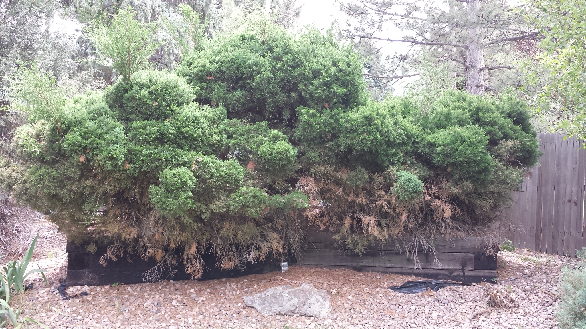 As sort of an aside, there is an area in our yard with a grouping of evergreen bushes. When we moved into the house, the former homeowner had carefully pruned the trees into the shape of three birds. That, too, was a short-lived experience. Here’s what the area looks like now…..