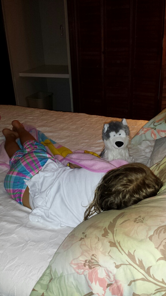 Mackenzie got a new stuffed animal while visiting Estes Park this week. Snuffles keeps watch while Kenz sleeps.