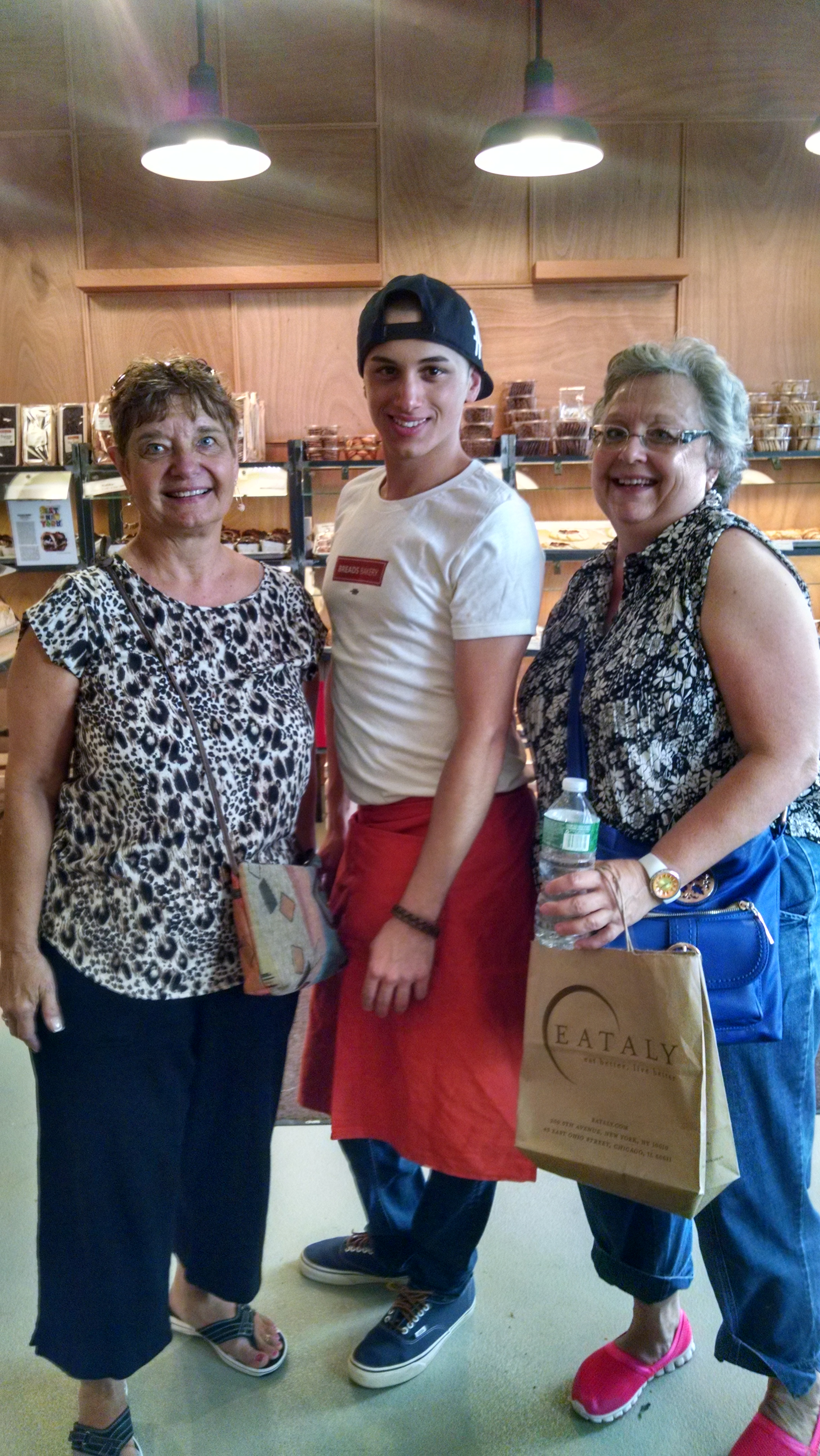 chocolate babka. I said, “Let’s go in and take a closer look.” We stood inside discussing the fact that we had never seen babkas before, chocolate or otherwise. A young man who worked there overheard us and expressed shock and dismay that we’d never tasted babka. “You have to taste chocolate babka! Feel this…it’s still warm! Come over here; I’m going to cut you each a piece to taste.” It was, of course, delicious. We decided we wanted a picture of ourselves in this cool bakery. Would Jonathan take one for us? No, he would not, because he wanted to be in it. So he called over a colleague, struck a pose, and we had our picture. He actually followed us out of the store, still filled with enthusiasm for us and for the bakery that employs him.