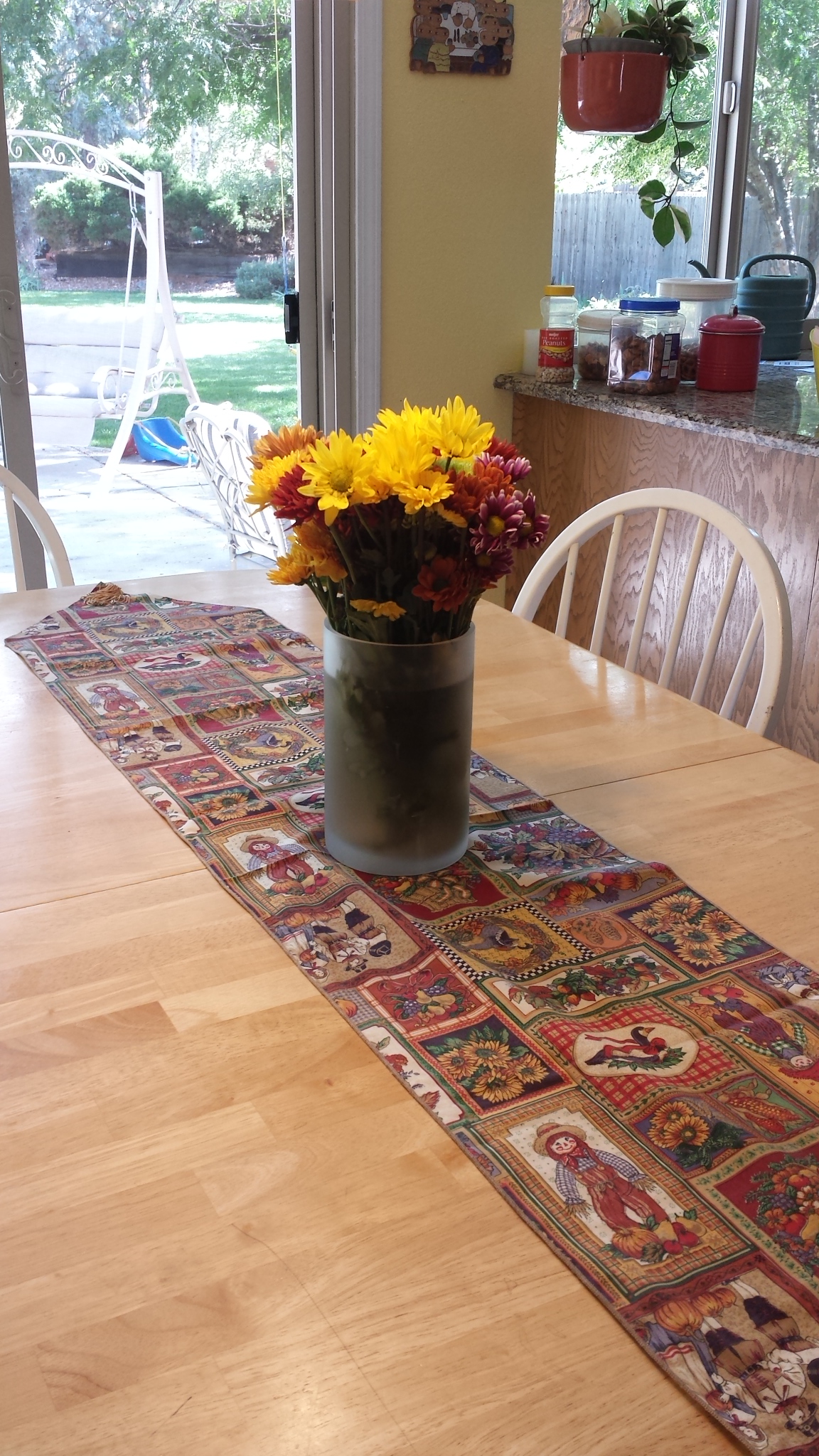 Suddenly, I remembered that somewhere deep in the bowels of my linen closet, I had an autumn-themed table runner. I opened the closet door, and dug around like a ground squirrel digging for acorns.