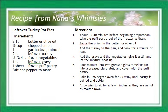 That turkey pot pie looks amazing! Made with gravy? Delicious! But always being a guest, I never have leftovers. I feel I’m really missing out.