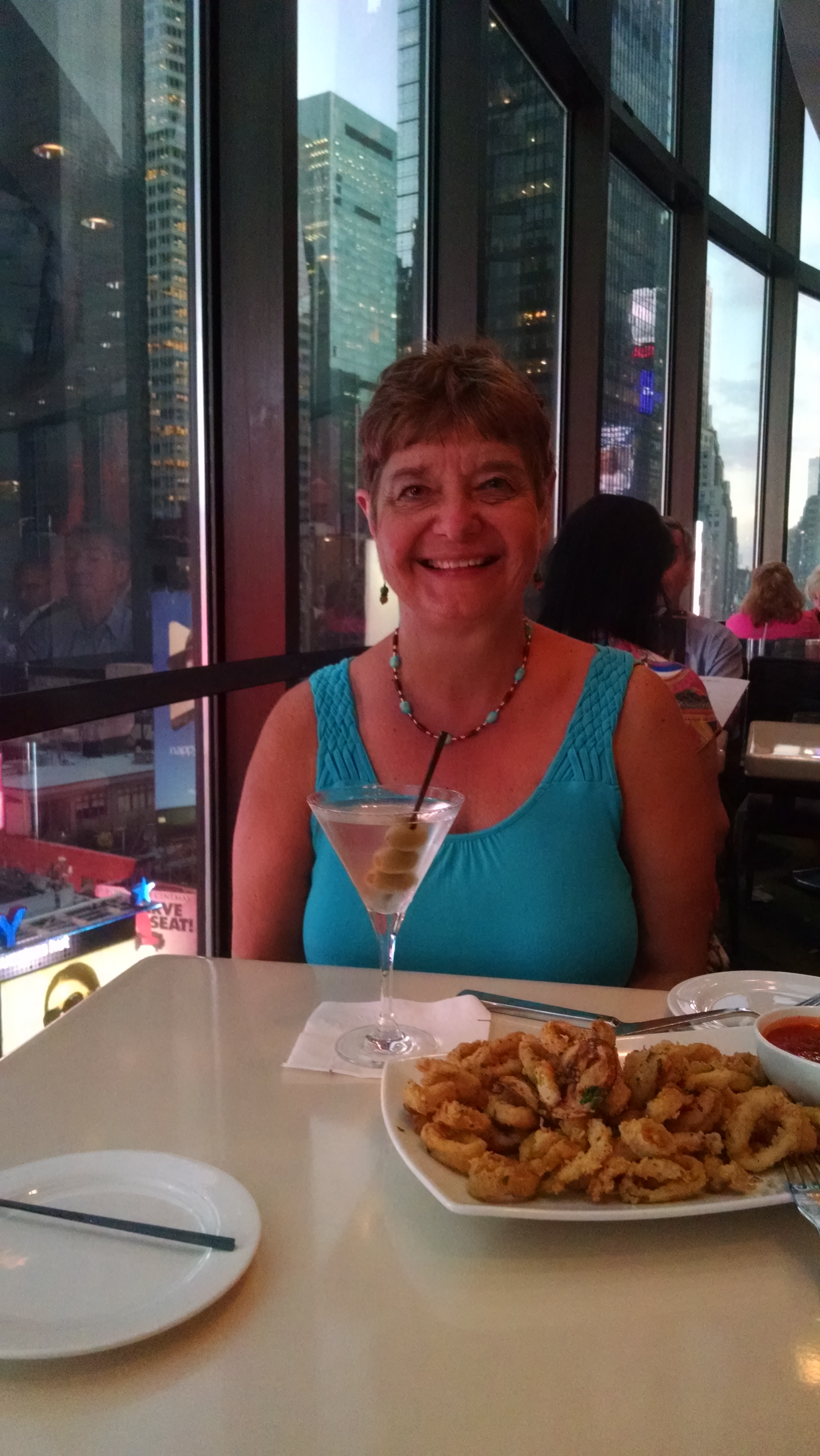 The other “must” for me is a drink and maybe a nosh in the 8th floor bar at the Marriott Renaissance Times Square. Their martinis are always yummy, and sitting at the window and looking down over the activity below is wonderfully entertaining. The neon signs outside the windows remind me that I’m lucky to be in the center of an amazing and vibrant city.