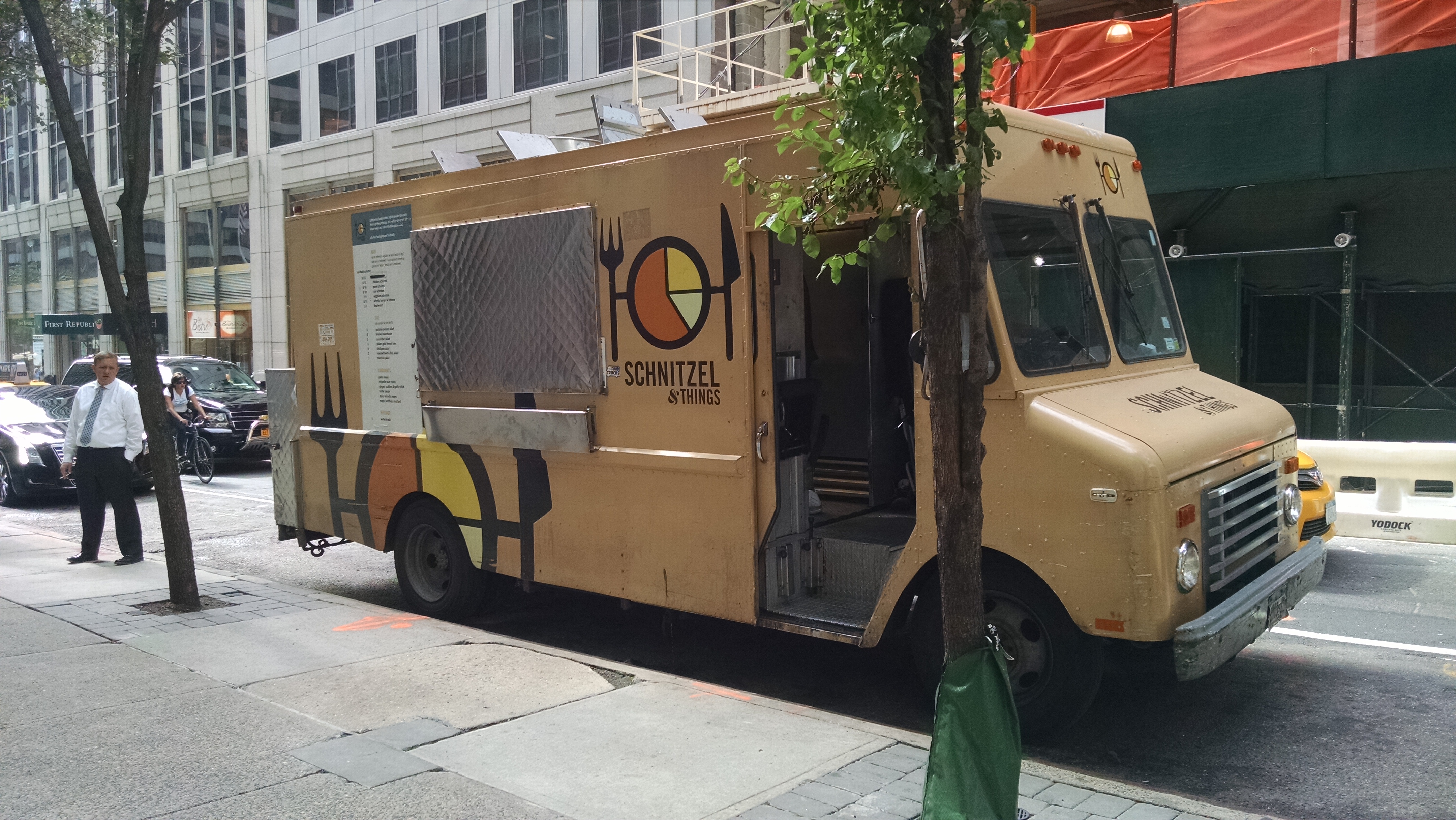 can imagine. Jen and I ate gyros twice, and they were delicious. No breakfast ever tastes better to me than the coffee and bagels from a corner—any corner—food cart (total cost: $2.50). And the food truck offerings are amazing. A few blocks from our hotel we saw two trucks next to each other. One of them sold assorted schnitzels and the other had grilled cheese. You can eat like royalty for next to nothing.