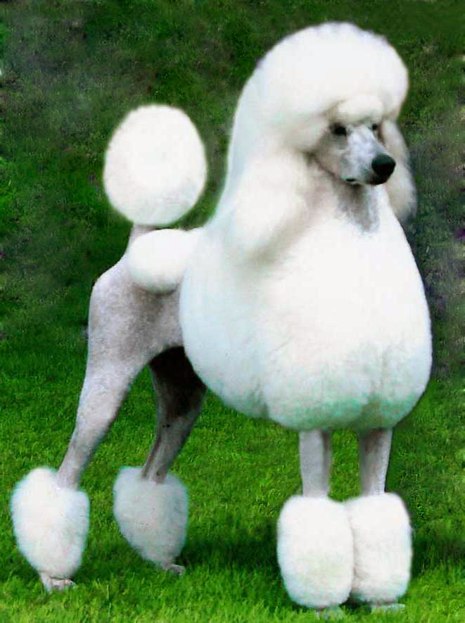 Except that accompanying this particular woman were three standard-sized poodles, white, all clipped in that weird show-ring way with the odd puffs of balls on the sides of their bodies and the poufs of fur on their heads, tails, and feet.