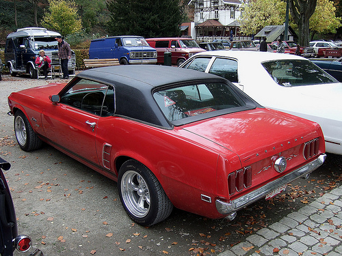 This is not a photo of my actual car; it is, however, a 1969 Mustang with a black hardtop. My top was white. And my wheels weren’t this fancy. Or so I’m told.