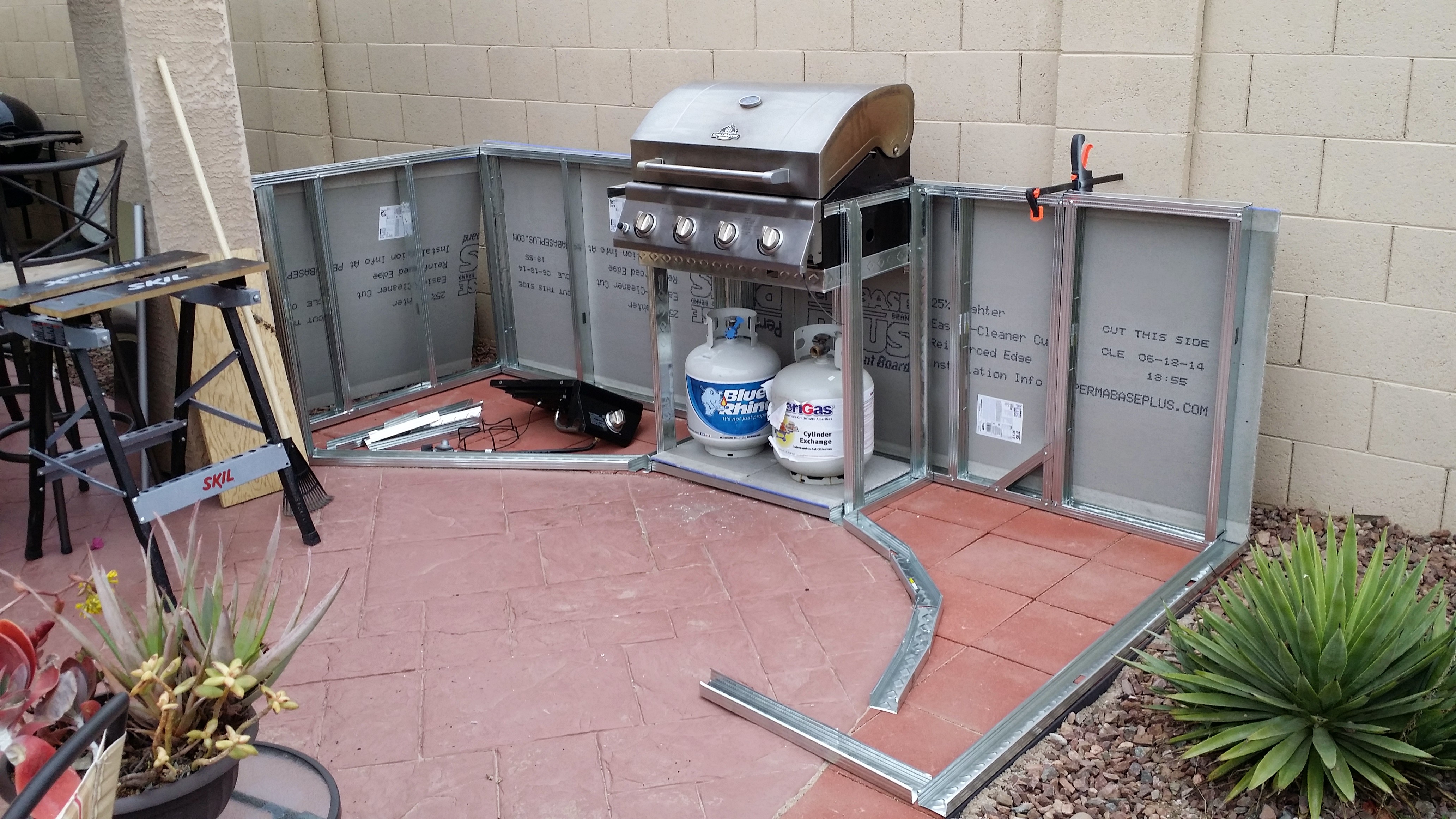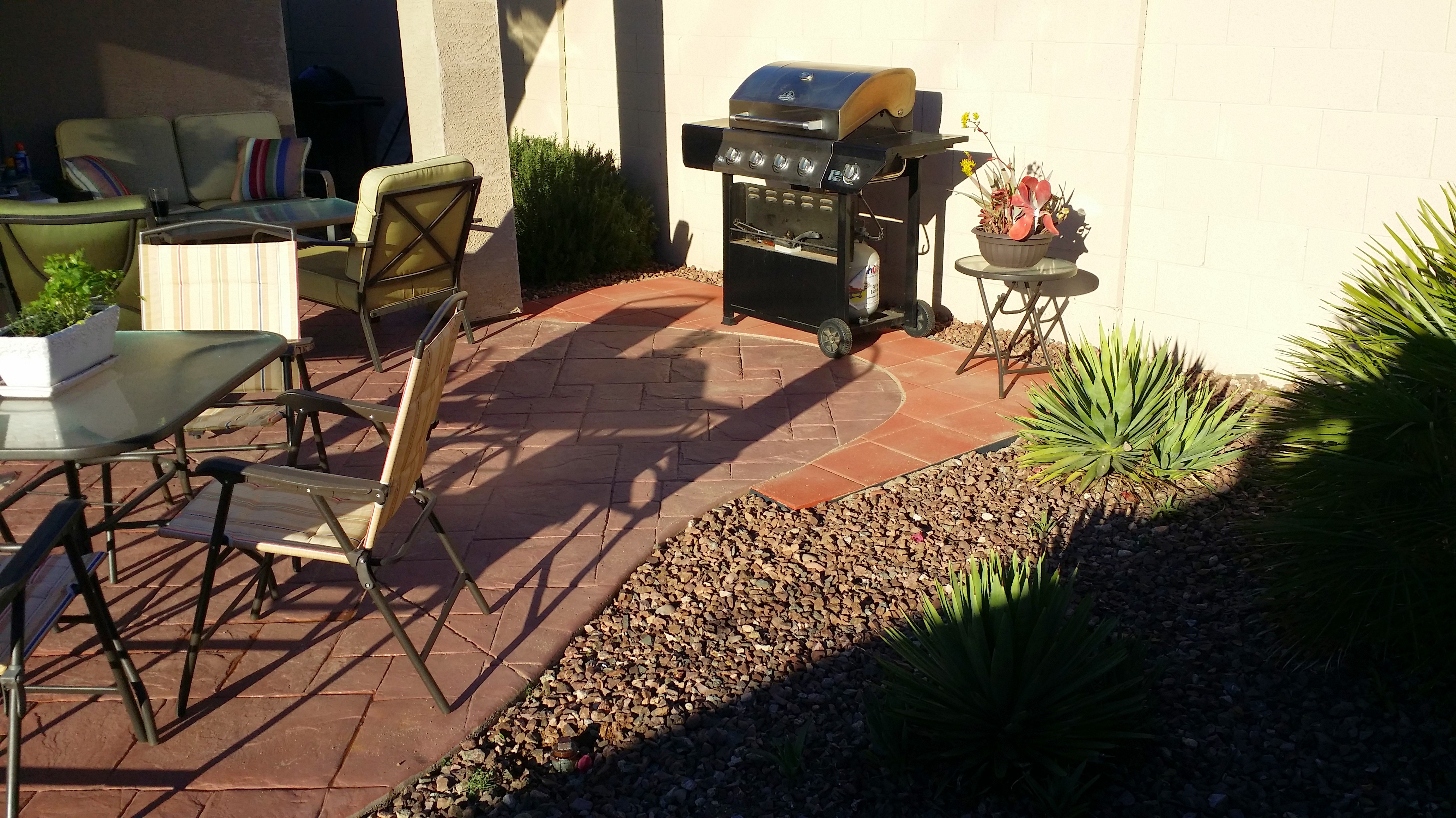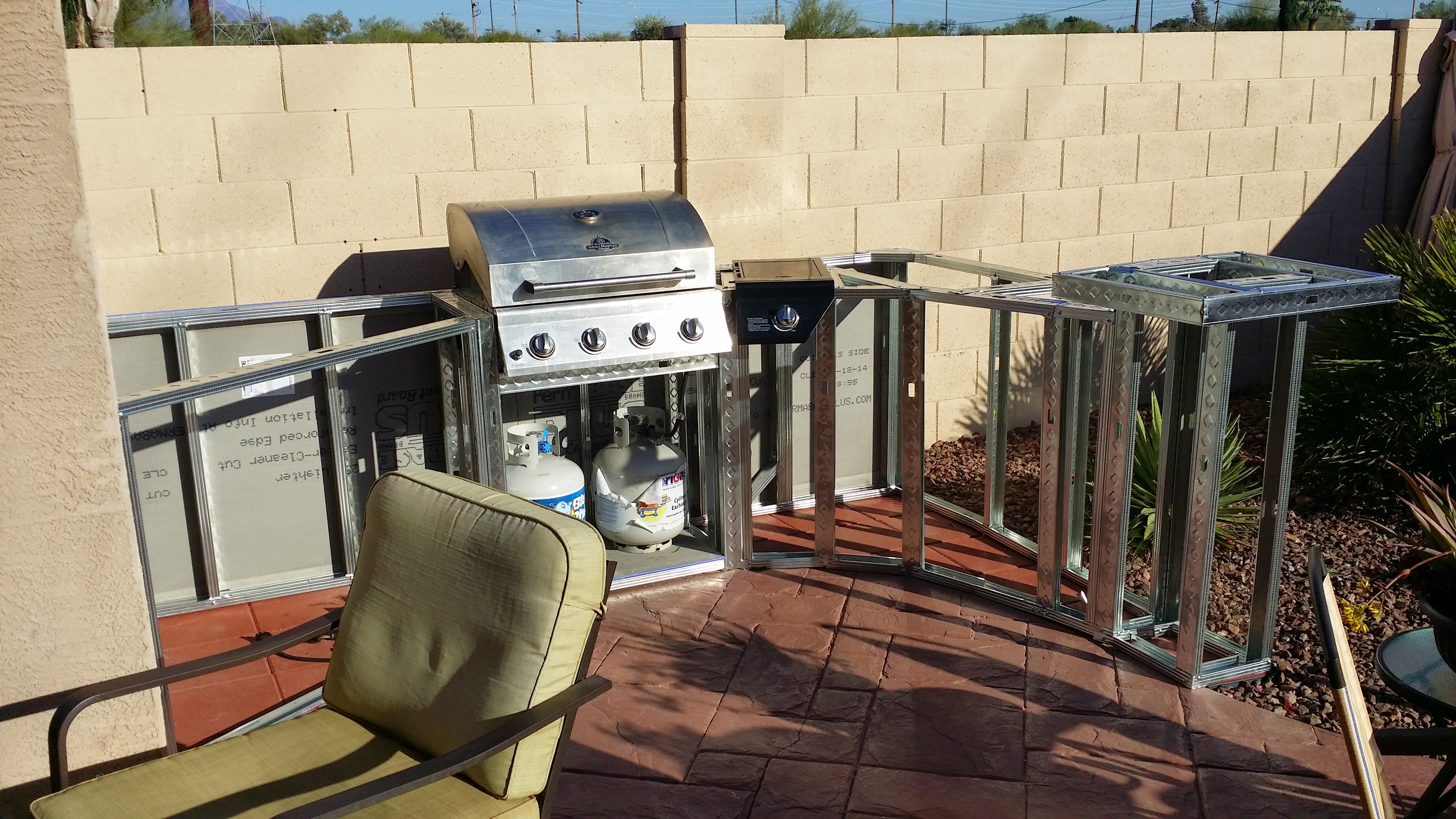 Some time ago Kris mentioned that she would like an outdoor kitchen in Arizona. Well, I was looking for something to keep me busy, so I decided to build her one. Having only a vague idea what it should look like, and without any plans, I dove in. Attached are photos of the initial construction of a patio extension and base for the kitchen through actually using the final product. It took a little longer than I anticipated, as my projects usually do, but with a few (well, more than a few) bruises, nicks and cuts, a lot of visits to Lowes and Home Depot (they each gave me my own vest and name tag), and a few online orders (but no vests), I am happy with the result, and I think that Kris and Jen are too.