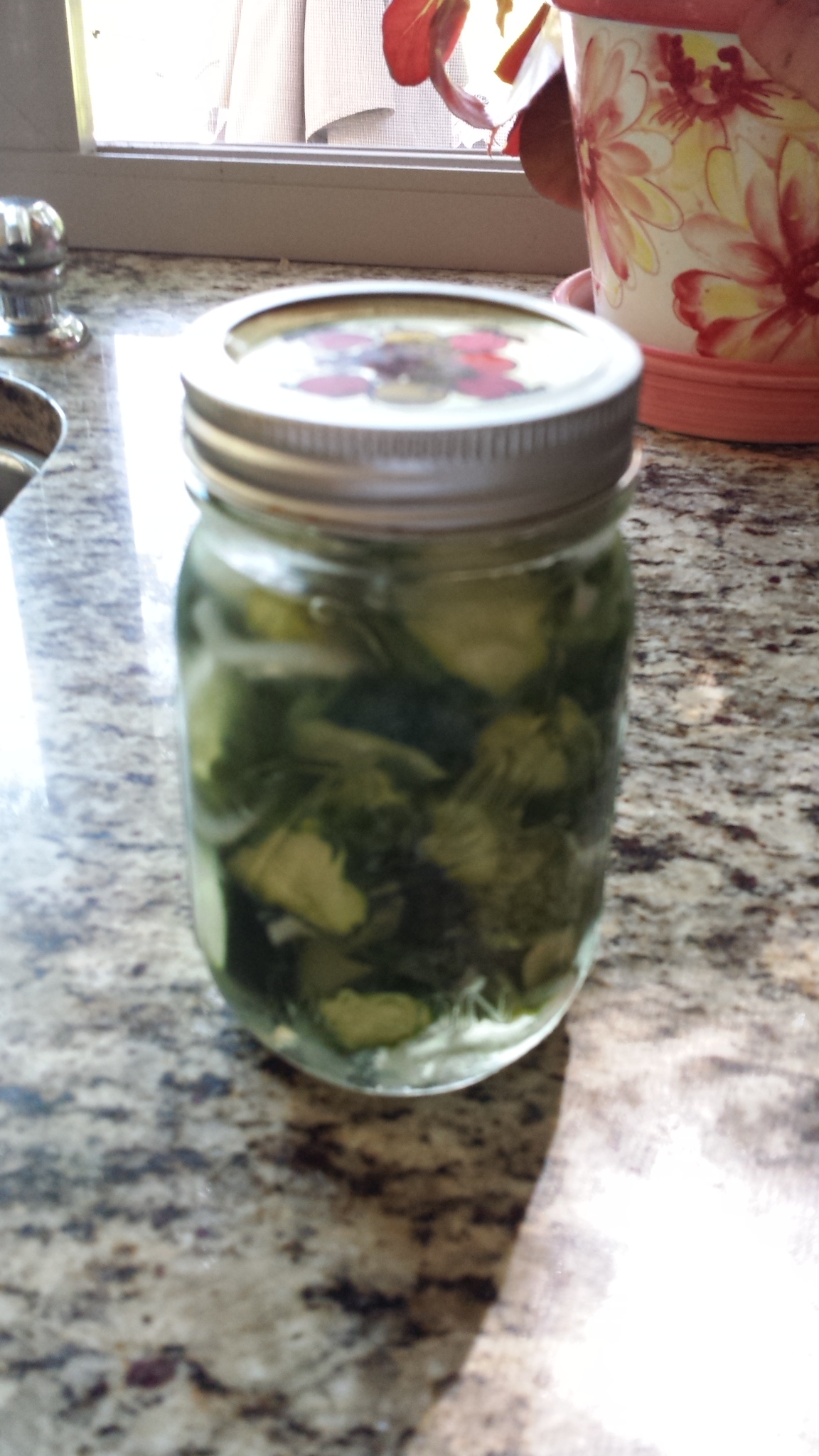 I had just gotten the jars of cucumbers into the pot of boiling water to begin the process that results in the sealing of the jars. I began wiping the stove and the countertops with a rag. I turned around to place the rag in the sink, and suddenly saw my vase full of dill.