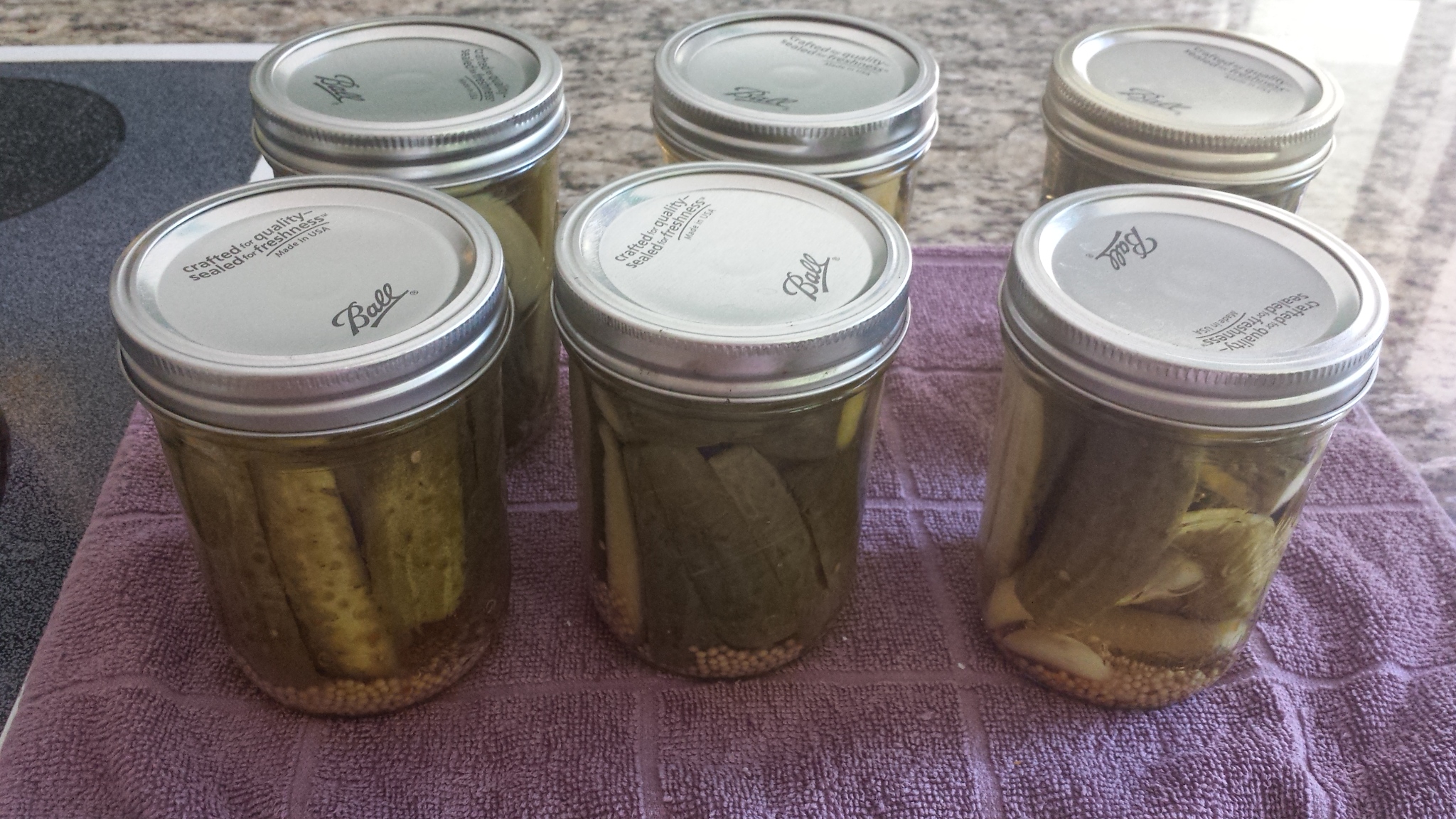 So, the next day, I began the process of putting up the pickles. The process involves sterilizing the jars and lids, carefully washing and cutting the cucumbers, putting the spices (including mustard seeds, garlic, and red pepper flakes) in the sterilized jars, preparing the pickling brine, bringing my massive canning pot full of water to a rolling boil, filling the jars with the cut cucumbers, making sure the rims of the jars are clean, closing the jars, and placing the jars in the boiling water.