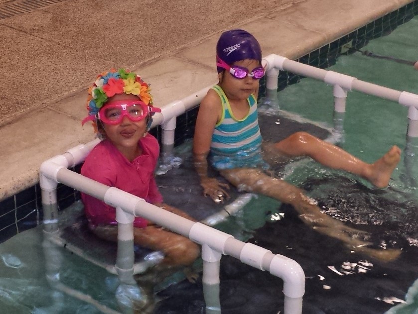 Swim caps and goggles are required attire, but some kids’ equipment is fancier than others. This photo of Mylee is proof…..