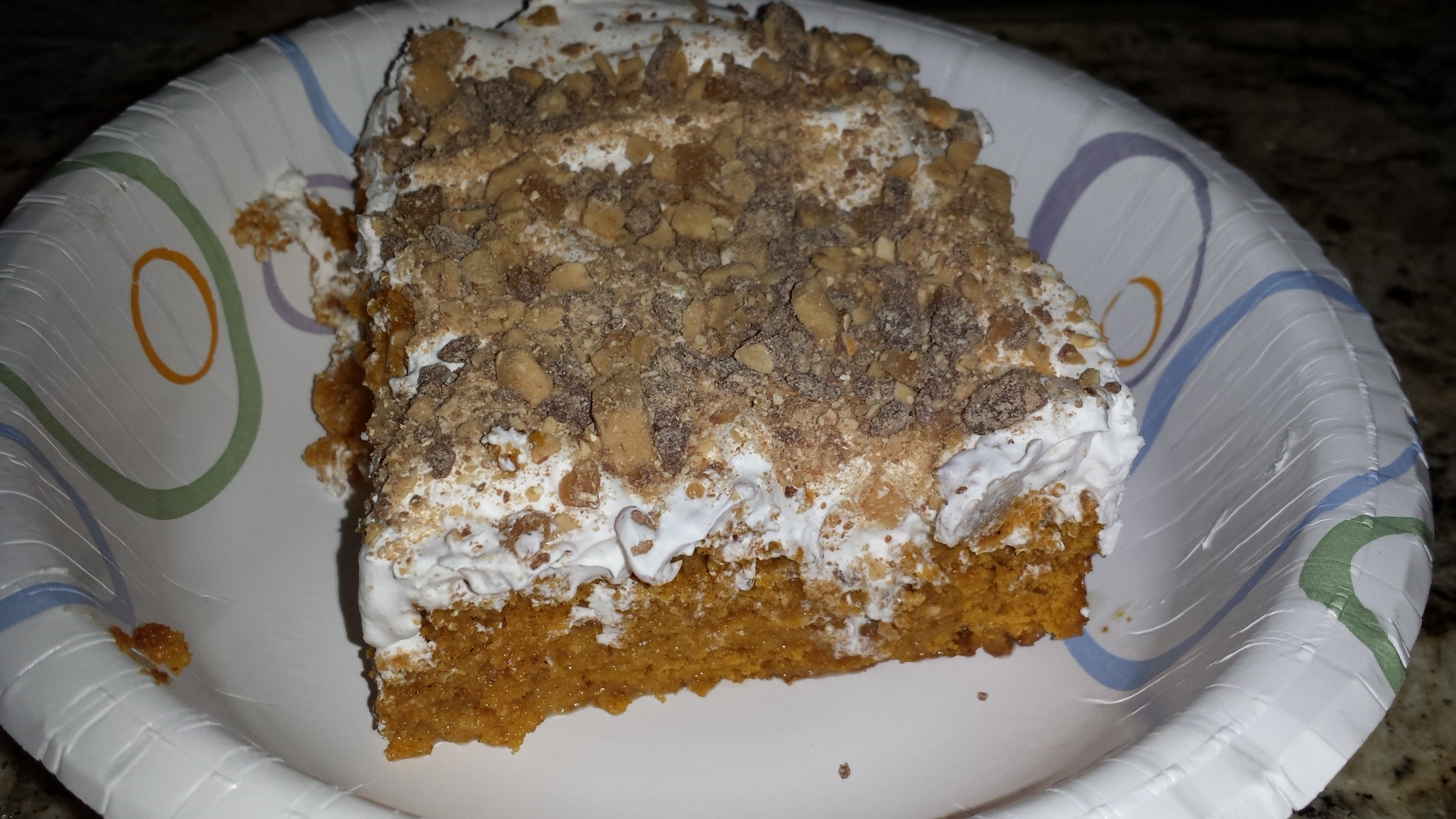 The other night Dave, Jll, and the cousins came for dinner. With Alastair in mind, I made a pumpkin poke cake. The recipe involves a yellow cake mix mixed with a can of pumpkin, baked and cooled. Once completely cooled, holes are poked into the cake with the end of a wooden spoon, and sweetened condensed milk is poured over the whole cake. Finally, it is finished off with whipped cream and toffee chips. I had Alastair in mind because I know he likes ALL THINGS PUMPKIN. If he drank lattes, he would undoubtedly be drinking Pumpkin Spice Lattes at Starbucks with almost everyone else that I know. While the others ate the cake, no one enjoyed it quite as much as Alastair. I say this because here is Maggie Faith’s take on the pumpkin poke cake: She ate the whipped cream and toffee chips off of the top. She poked around a bit on the cake, and then said in an objective, absolutely non-judgmental way (and I quote), “This looks like Sophie’s cat food.” Boom. I told her she should consider a career as a restaurant critic. However, not to be put off, Alastair immediately said, “I’ll eat it!” and did.