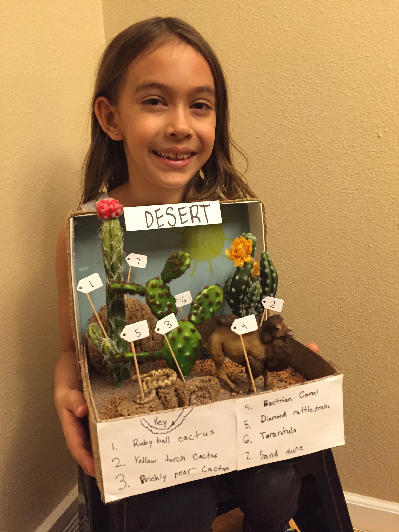 My granddaughter Kaiya has been studying the desert in her social studies class (or whatever they call it when you’re in second grade). The grand finale was a diorama featuring some aspects of desert life about which they have been studying. She and I have been discussing her studies for the past month or so, so she was proud to show me her project….