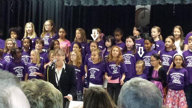 Tuesday night we watched the three youngest McLain kids perform at the Southmoor Elementary School band and choir concert. Alastair plays trombone (or at least tries to, as he had gotten his braces the day before). Dagny and Magnolia sing in the choir. And Dagny plays flute in the band. For the most part we enjoyed the concert, though there was one song that was so awful that people were visibly cringing. As for me, I very unprofessionally began to laugh so hard I had tears. Addie leaned over and asked me if I was laughing or crying. I told her both. Here is a photo of Dagny and Maggie singing. You can identify them from the arrows….