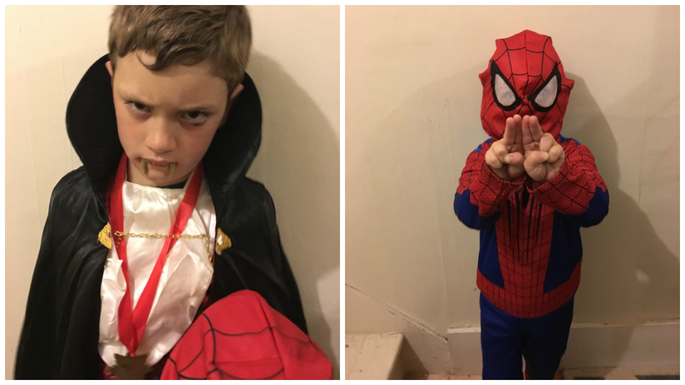 As the night went on, I began getting photos of the grandkids, starting with the Vermont clan, who went out trick-or-treating earliest. Despite the fact that Joseph is perhaps the sweetest-natured child I have ever known, he makes one heck of a scary Dracula, doesn’t he? As for Micah, he is ready to go out and fight crime. You can tell by his hands….