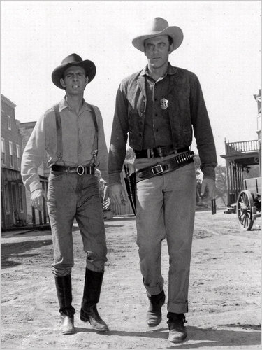 Marshall Matt Dillon and his sidekick Chester packing heat and perhaps going to the barber in Dodge City.