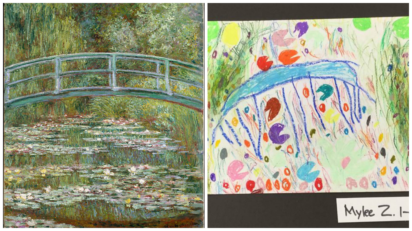 The school which Kaiya and Mylee attend has what seems to this rank amateur as a very good art program. Parents and grandparents know that Art is no longer a regular subject, and is handled differently in each school district. Their district offers Art as one of the Special Subjects, alternating with other subjects such as Technology and PE. But their school features something called Artsonia, in which Art teachers post students’ art projects and subscribers (who are authorized by the parents) are alerted every time the student has a new piece of art posted. I really love that, especially since I am 900 miles away from their art projects. Yesterday I was alerted that Mylee had a new piece of art posted, so I eagerly checked it out. Apparently the first graders are studying Impressionist art, something I didn’t realize existed until college! Here is Mylee’s masterpiece, next to Monet’s original work entitled Bridge Over a Pond of Water Lilies. You can decided which is which. For my part, I am extremely impressed….