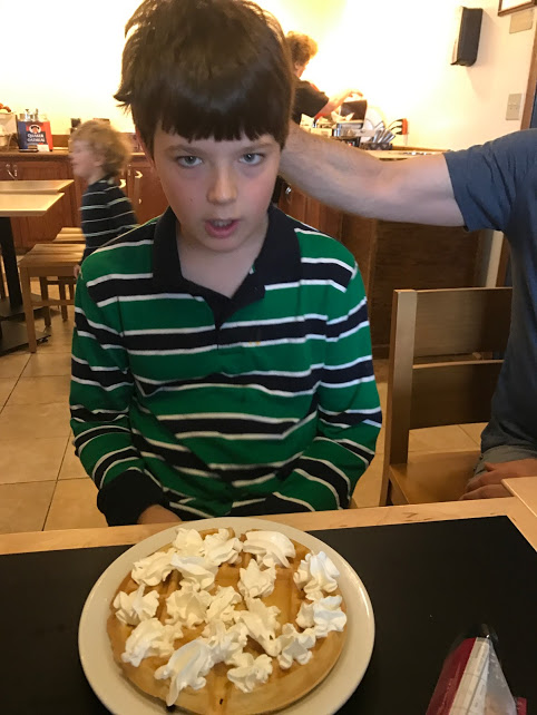 We stayed at a hotel that served a free breakfast each morning. Alastair came down the first morning, hair quite askew, and made his version of the perfect waffle — no butter, no syrup, lots of whipped cream….
