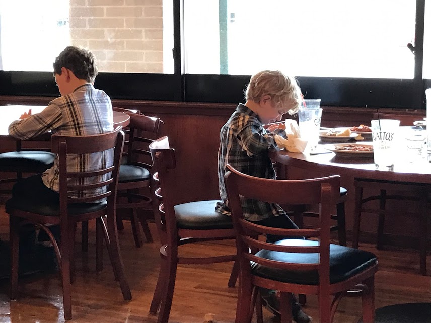 The night of Wilma’s funeral, the family gathered at a restaurant. The adults liked chatting with family members they hadn’t seen for a while, but it was kind of boring for the kids. Joseph and Micah, however, were able to keep themselves occupied and content for quite some time, perhaps enjoying some quiet time away from cousins — and each other….