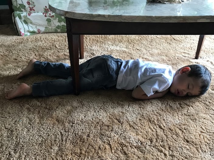 I assure you that I’m not complaining. I love every minute that I spend with my grands. Even time in a car. And while Cole is very busy, he’s also very funny. My grandkids all make me laugh, and it’s good to laugh. And thankfully, Cole wears himself out, as indicated by his falling asleep in a nontraditional spot under the coffee table in our living room….