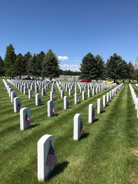 Jen came for the barbecue I held yesterday, and she and I went out to the cemetery together. I never feel called to go more often than once a year, because it’s a national cemetery so it is always pristine, and I know Mom and Dad are in heaven. But I try to go once a year, mostly because the cemetery looks so pretty, what with the flags on all of the graves and all….