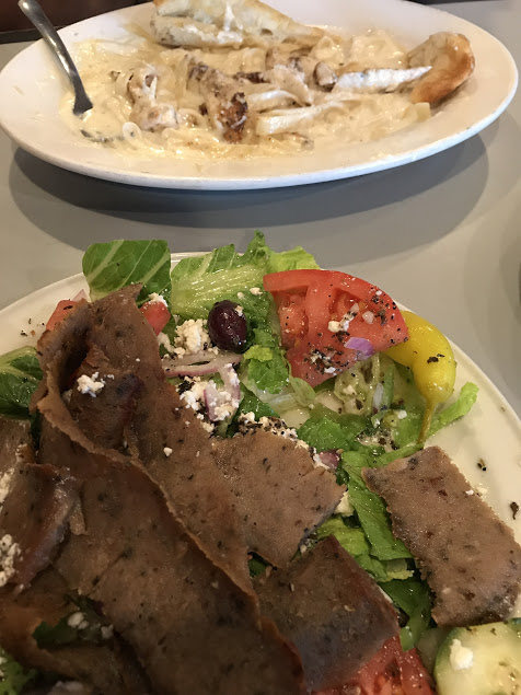We sat down looking dazed and exhausted. So exhausted, in fact, that when the server came to take our order, Bill said, “I’d like the chicken fettucini, and add chicken.” The three of us got a good yuck about that. Then it was my turn. I kid you not. I said, “I’d like the gyros salad, and add gyros.” And I wasn’t even kidding.