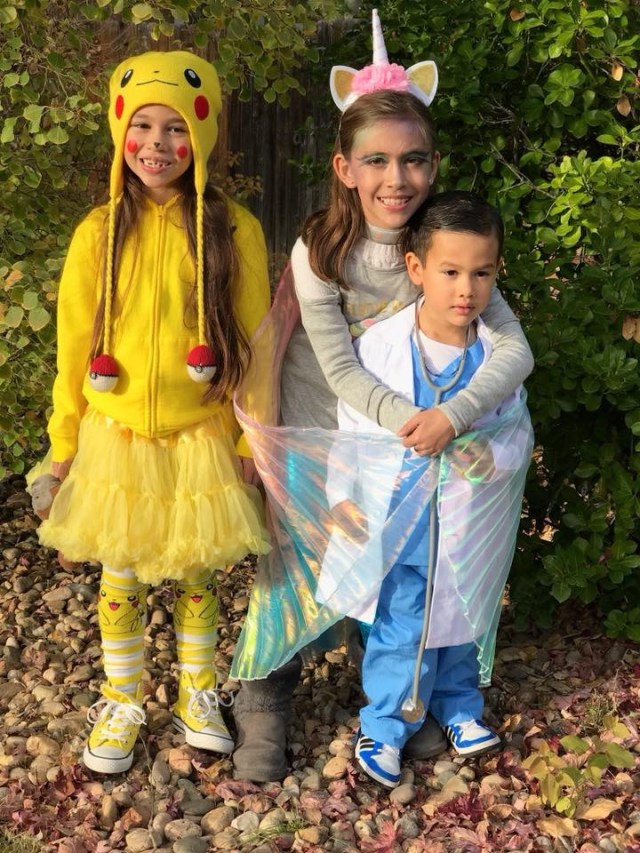 Mylee is Pikachu, Cole is a doctor, and Kaiya is a mash-up of a mermaid, a unicorn, and a fairy…..