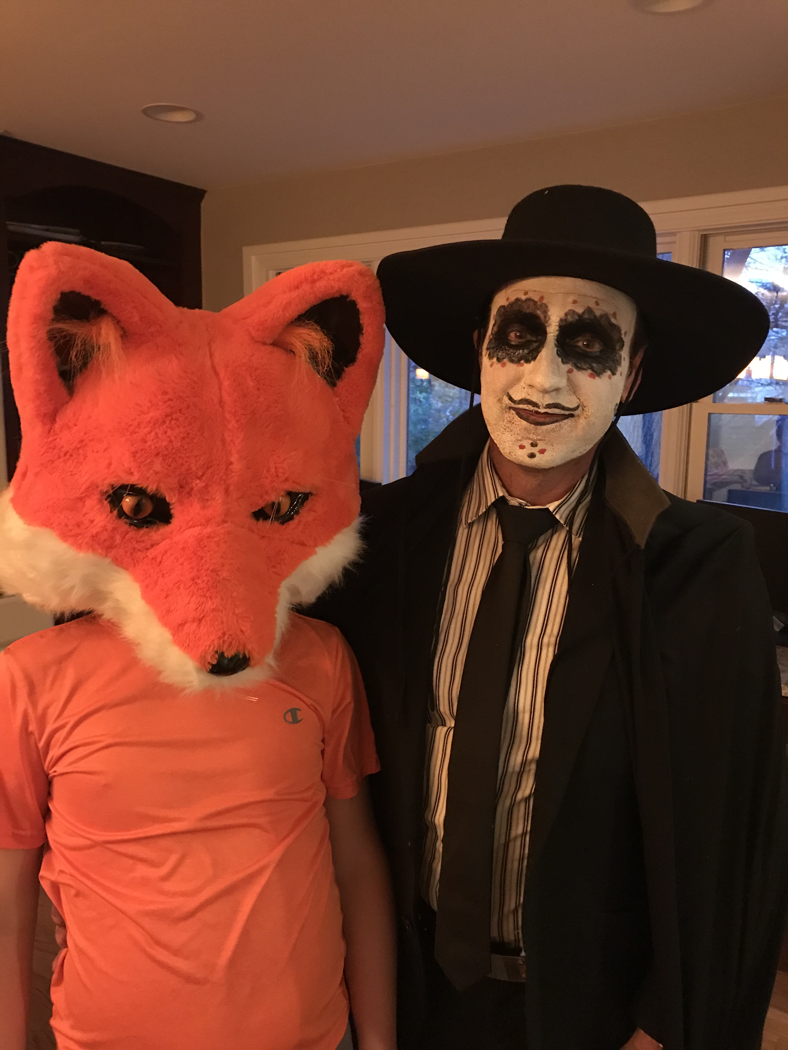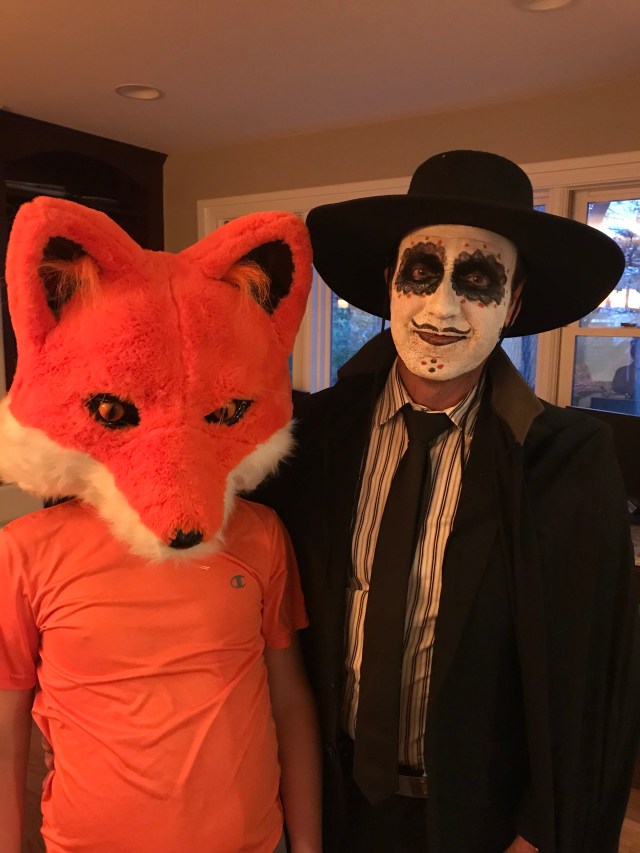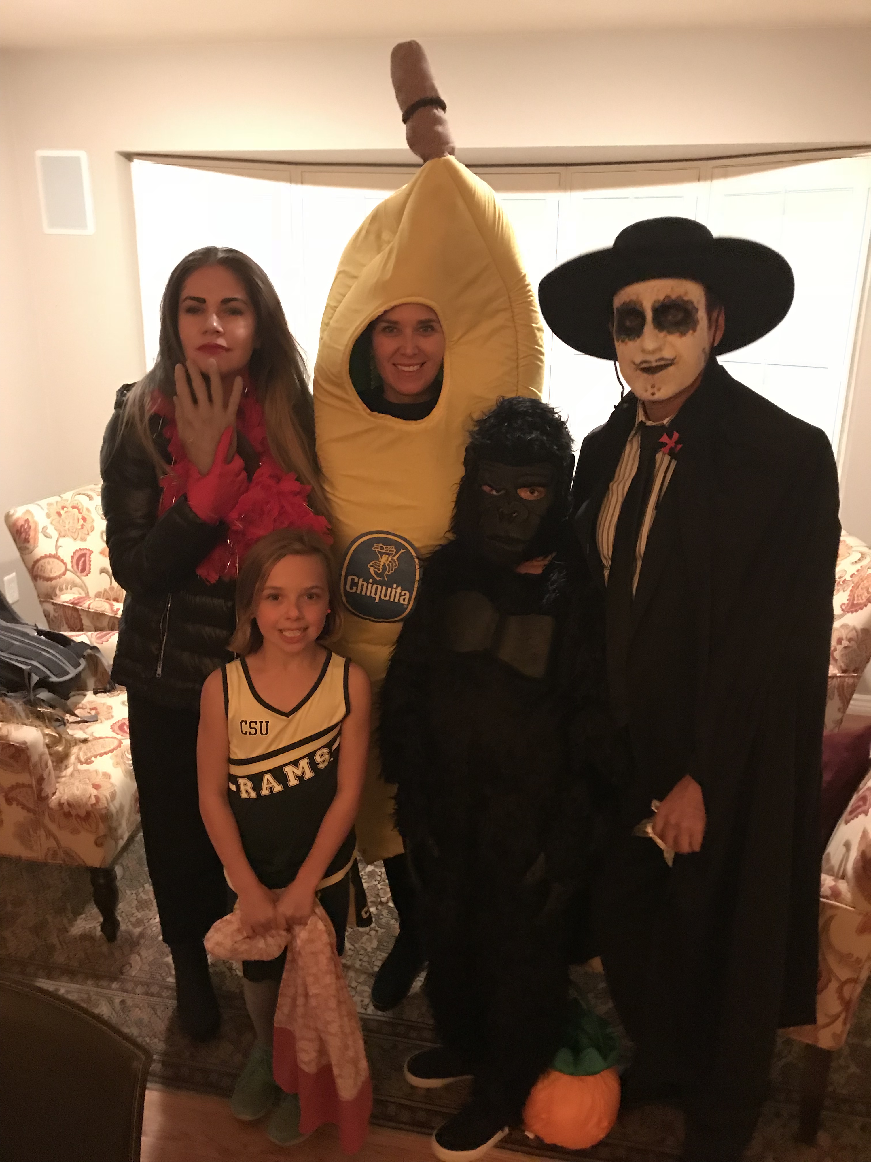 This year the McLains were accompanied by their Aunt Julie (a banana) and their Aunt Emma and Uncle Allen (scary somethings-or-other). Dagny was the gorilla and Magnolia was a CSU cheerleader. As for the fox, well, that’s Alastair, and I have no idea how he sees out of that mask…..