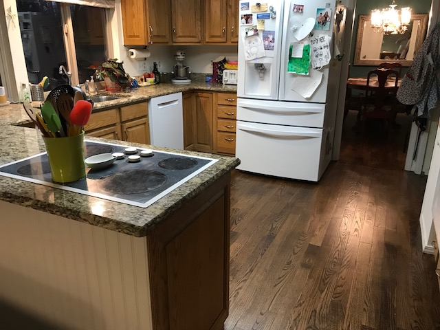 Bill did an immense amount of work, and it’s as good a job as any craftsman would have done. The job required removing the carpeting, removing the pressboard that lay underneath, installing plywood before finally nailing in the hardwood. He did that in two big rooms, the staircase, and the upstairs hallway. In addition, he removed circa 1970 wall paneling and put up drywall on one wall, and remove wallpaper from another wall. He painted our fireplace, installed canned lights in the family room, and redid the mantle.