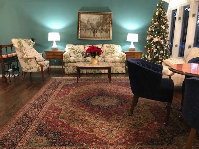 The living room floor was covered in the carpeting that I said I would replace immediately. Finally, 25 years later. The sofa, chairs, and coffee table belonged to Bill’s mom, Wilma.
