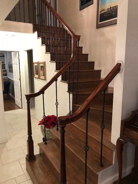 The stairway is perhaps my favorite area. Previously, they were carpeted in that same carmel-colored carpeting and the spindles were wooden. I love the fresh look of the metal spindles and the dark wood.