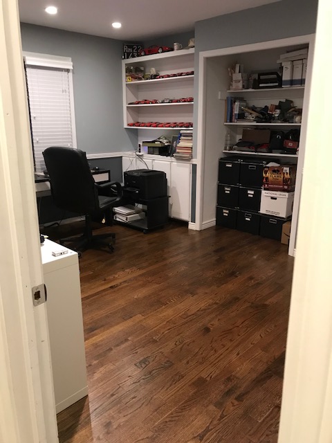 Bill installed wood floors in his office several years back, but they were a very light color. The floor was sanded and restained to match the other rooms.
