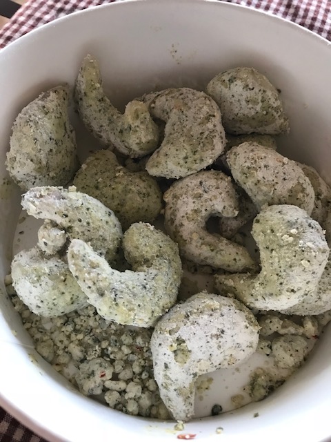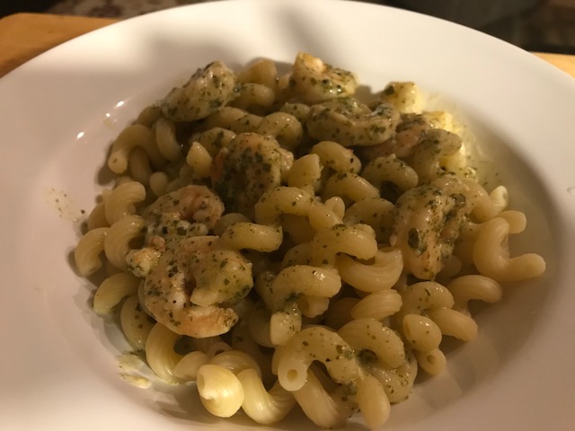 When Bill and I were in AZ in November, I went to the fancy Fry’s grocery store that is about a 15 minute drive from my house. Fry’s is AZ’s version of Kroger, and this particular grocery store is brand new and has everything ranging from a sushi bar to a wine/beer bar. As we walked around, I noticed a bar located between the deli and the meat market that featured lots of different frozen meals sold by the pound. It intrigued me, and I was checking it out when a woman who was scooping one of the meals into a bowl asked me if I had ever tried any of the choices. I told her no, that I had never seen anything like it before. She raved about the ease and tastiness of the food. So earlier this week when I did my first shop to restock my larder, I decided I would try one of the meals. I chose shrimp with pesto al fredo sauce. The shrimp are frozen with the sauce……