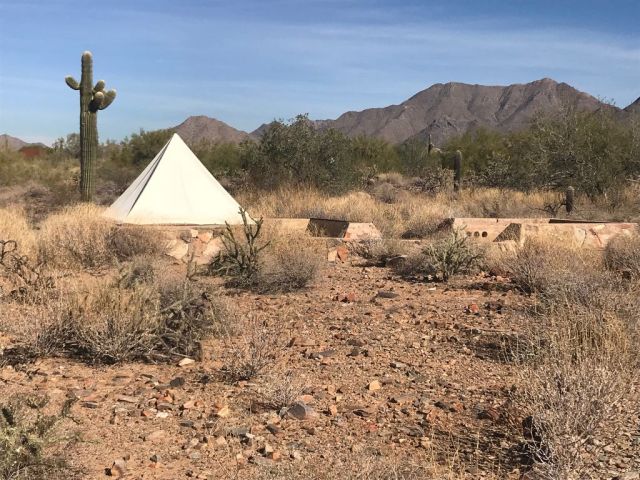 Since the time of Frank Lloyd Wright and continuing today, students at Taliesin stay there, and build their own housing. Taliesin West is built on a large acreage, and students build or rebuild a site in the surrounding desert, in which they live while in residence. These are essentially tented constructions on slabs……