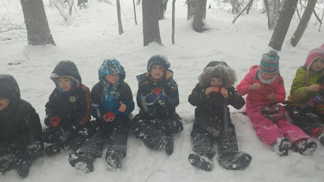Bill and I are big fat babies about snow these days, and we live in the desert during the winter for this very reason: to avoid the snow. While Coloradans in general are better about snow than, say, Alabamans when they get a few flakes, we still can be heard grumbling, and our driving is admittedly not the best. On the other hand, Vermonters are not a bit put out by snow, even more than a few flakes. Heather sent us a photo of our grandson Micah at a school outing in Montpelier, VT. One of the classes his kindergarten glass takes is called Educating Children Outdoors (ECO), and they don’t let a little thing like the recent Nor’easter stop them from learning. Heather said Micah is the one drinking tea in the photo. I have to take her word for it because they are all so bundled up that I wouldn’t be able to pick him out without help. But God bless the hearty New Englanders…..