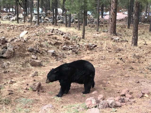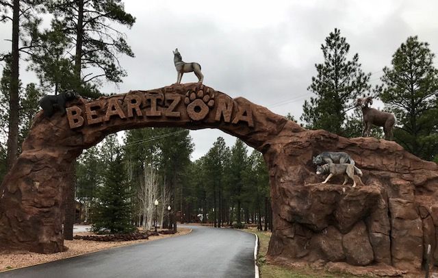 The next morning, we set off in snow flurries for our last adventure, Bearizona in Williams, about 30 minutes away. Bearizona is privately funded and features a drive-through wildlife park. Visitors may drive their own vehicles, but if they want the full experience, the best choice is to take the “Wild Bus Ride.” Once we were on the open-air bus, our driver/guide set out, and we began our trip through the animal park. She gave us a lot of information about the park and about the animals. Most of them are rescue animals. It’s hard to believe that people actually think it’s ok to cage a bear or wolf as a “pet,” but that happens, and when Fish and Wildlife nab these evildoers, the animals are often sent to Bearizona. The animals are in their natural habitat, but the different species are separated by fences. Because they’re still wild animals. They are not fenced back from the road, however, so they might come right up to the bus or saunter slowly across the road. The animals are doing what animals actually do in nature, and it is very much fun to see them. Our driver knew every animal by name, and she often predicted individual behaviors. Despite the cold weather, we had a great time……